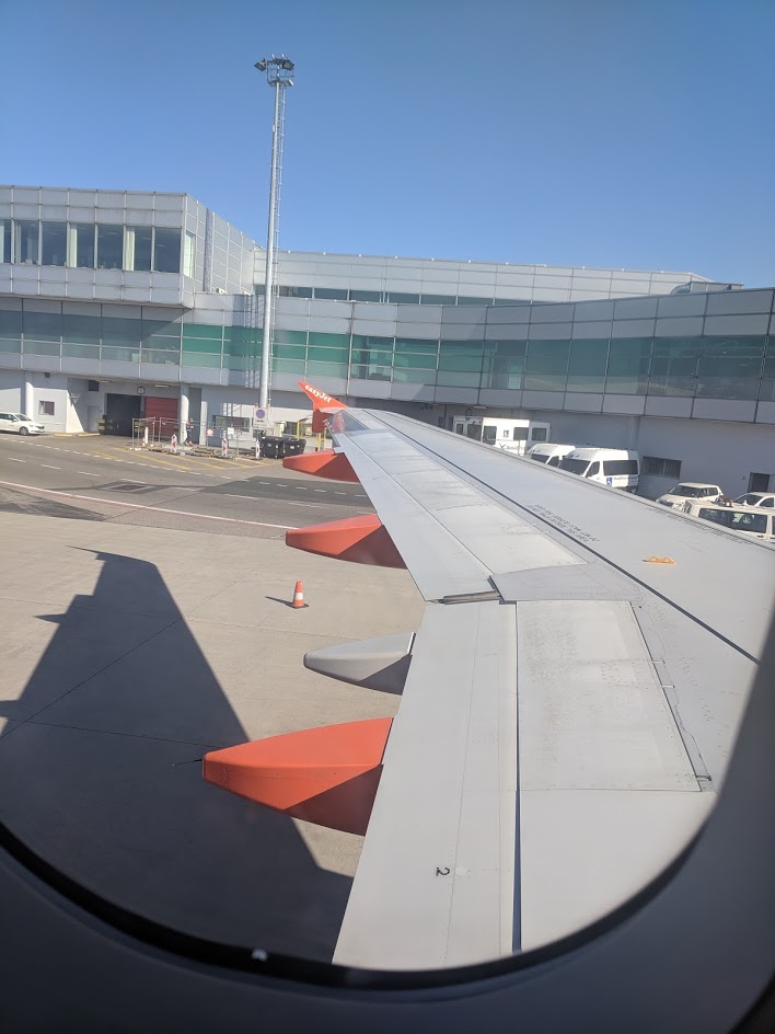 Do nebes jsme vzlétli po půl páté odpolední. Let byl naprosto bezproblémový (nuda), usazena jsem byla směrem k uličce (konkrétně jsem trůnila na sedadle 17C) vedle dvou manchesterských děvčat (patrně) o několik let mladších, než jsem já. Jelikož jsem využila leteckou společnost EasyJet, letušky nám dopřály divadélko na téma: „Co dělat, když se v letadle něco posere, a za chvíli se zřítíme dolů“. Spíše než instruktáž mě ale zaujala jedna letuška (tj. stevardka), která značně připomínala robota. Byla tak dokonale (na/z)malovaná, až to působilo nelidsky, tedy uměle.