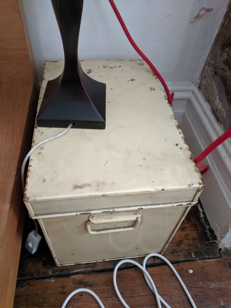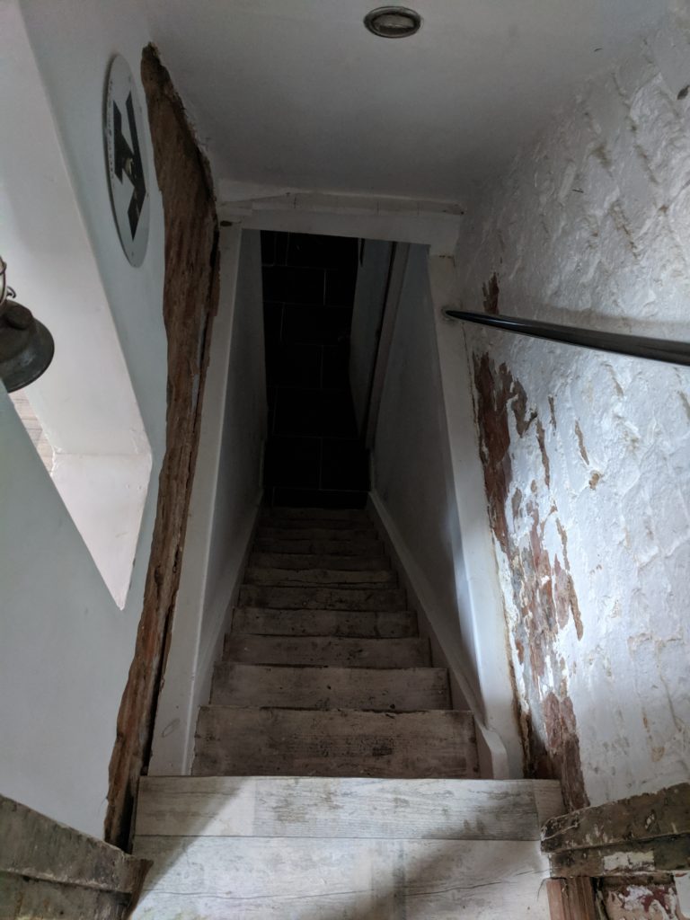 Pravděpodobně nejhezčí místností v celém baráku je kuchyň, pro nás Čechy trochu netradičně umístěna ve sklepení. Člověk musí nejprve zdolat příkré schody vedoucí z obývacího pokoje (viz obrázek dole), aby pak zjistil, že nejde otevřít lednice. Tedy, otevřít lze, ale z opačné strany, než jsme u nás zvyklí No jo, Angličani to prostě musí mít všechno naopak.
