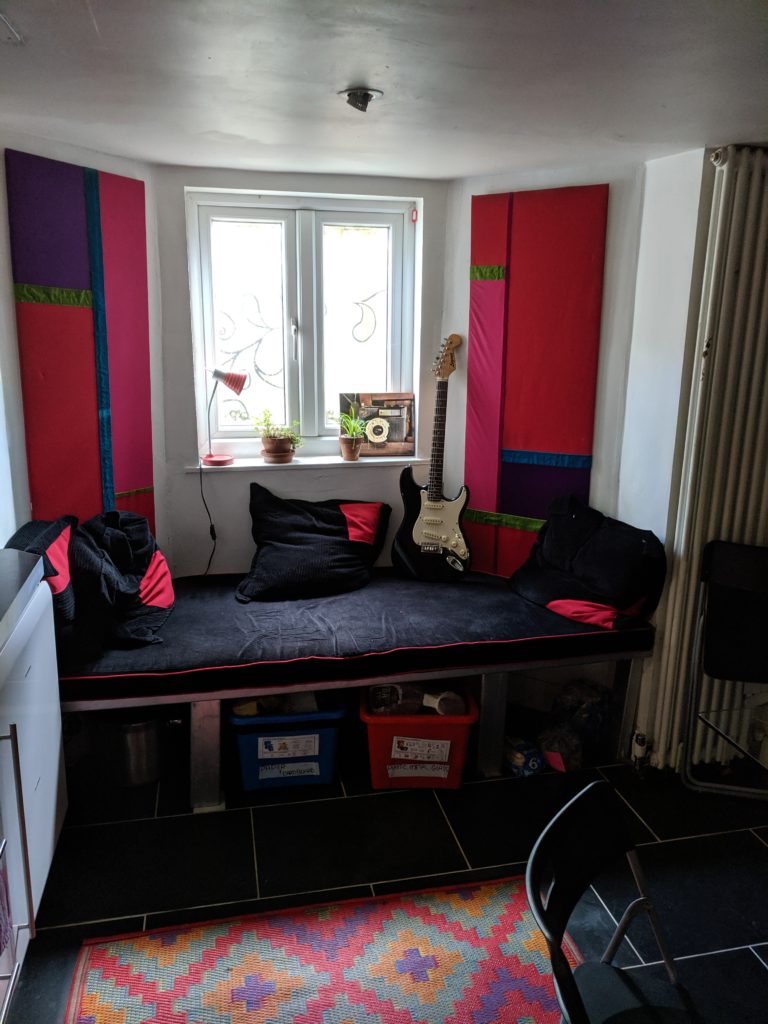 Na závěr ještě fotka obývacího pokoje nebo možná ložnice Adama. Ano, Adama, toho odborníka přes dveře a zámky. Tvrdil mi totiž, že občas přespává na gauči v obývacím pokoji, občas v některém z pokojů (pokud nejsou všechny pokoje obsazeny hosty asi).