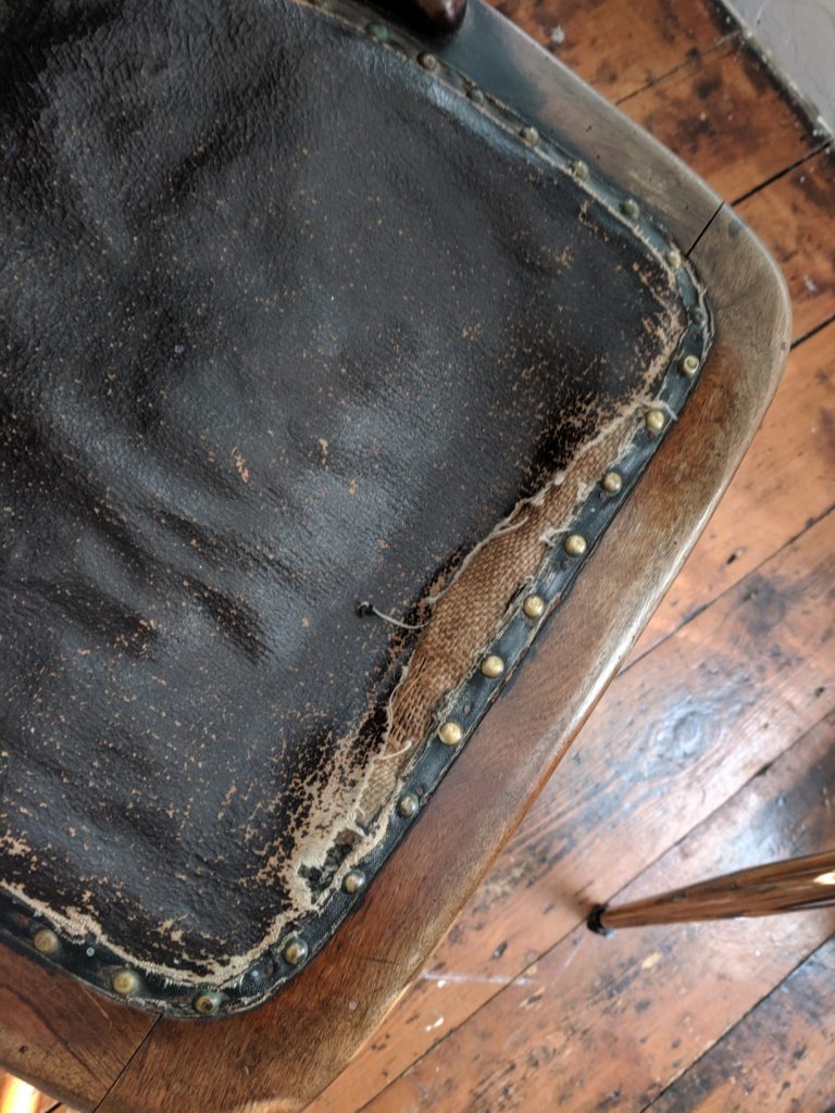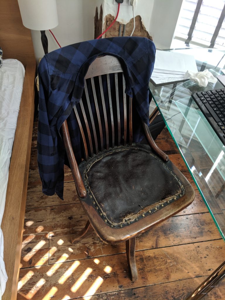 Velmi mě zaujala stará židle u pracovního stolu. Nedá se říct, že je to ta nejpohodlnější židle. Kdybych na ni měla sedět každý den osm hodin sedm dní v týdnu, možná bych se proměnila v pařez. Zajímalo by mě, ve kterém vetešnictví ji sehnali. Celkový a detailní pohled na židli jen zobrazen na následujících dvou fotografiích.