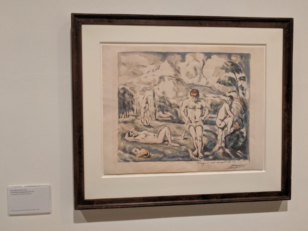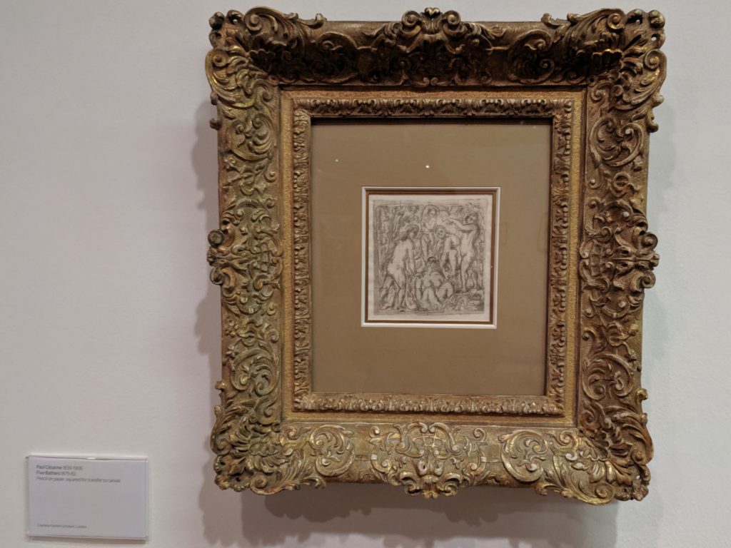 Včera jsem krom parku navštívila také Whitworthskou uměleckou galerii situovanou na okraji parku. Galerie je součástí Manchesterské univerzity a vstup je zdarma (ostatně jako tomu je u prakticky všech galerií a muzeí). Musím se přiznat, že už jsem dovnitř nahlédla ve čtvrtek (tj. day 3). Tehdy jsem ale zavítala pouze do obchůdku. Po včerejšku ale musím říct, že onen obchůdek mě zaujal víc než samotná galerie (čímž nechci ale říct, že je špatná). Galerie prošla v posledních letech velkou rekonstrukcí a rozšířením a v roce 2015 byla znovu otevřena. V témže roce dokonce získala nějakou cenu typu galerie roku. Okolí galerie i prostory uvnitř jsou moc pěkné. A celkový dojem z návštěvy je (jak bych to správně nazvala?) … no příjemný. A co bylo k vidění? Taková všehochuť – sbírka textílií z celého světa (od 3. století po současnost), sbírka textílií z islámského světa, tapety, novodobé umění, fotografie nějakého asijského umělce, kresby a malby Pearla Alcocka, práce několika současných muslimských umělkyň, instalace Ibrahima Mahama: Parlament duchů (reflektuje historii Ghany), starodávné textílie z And a mnoho dalších. Zlatým bodem měla být výstava kreseb a grafik Paula Cézanna (konečně někdo, koho znám). To mě ale nenadchlo. Paul Cézanne je totiž znám zejména pro svoje krajinomalby a malby zátiší. A to tu chybělo. Dvě jeho díla jsem pro Vás pro pokochání zvěčnila.