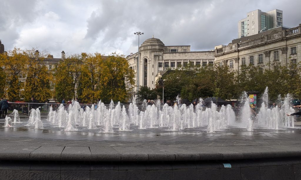 Dost bylo kanálu! Poté jsem si to konečně namířila do Piccadilly Gardens, jež se nachází v těsné blízkosti Severní čtvrti. Tohle místo bych přirovnala třeba ke Svoboďáku v Brně. Je to takové hlavní manchesterské náměstí. Na rozdíl od brněnského Svoboďáku se Piccadilly Gardens pyšní velkým množstvím zeleně. Zároveň to trochu připomíná brněnský Mendlák, jelikož se tu kříží velké množství autobusových a tramvajových linek (žádné šaliny ale!). Ani jednu slušnou fotku Piccadilly zahrad jsem bohužel nepořídila. Jediné, co jsem zachytila, jsou fontánky (btw., pokud dobře zaostříte, uvidíte mezi fontánkami malé chlapce).
